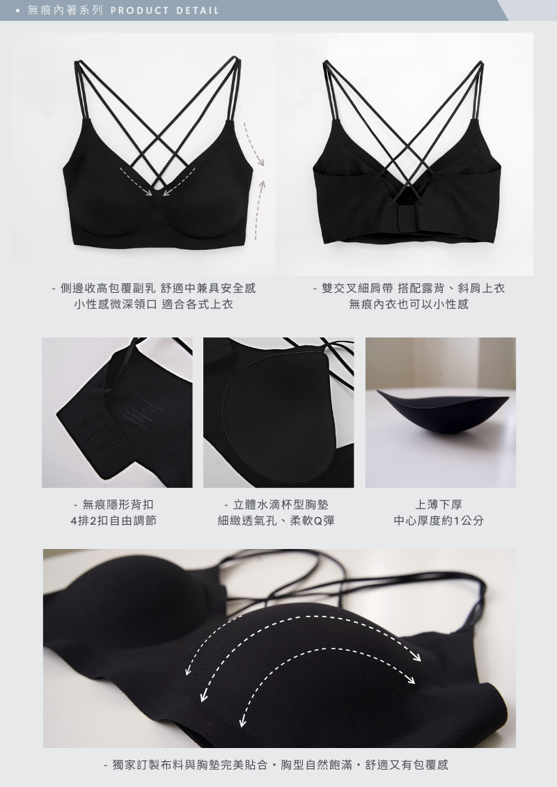 1.美背後交叉設計,可搭配各種斜肩或是挖背的上衣