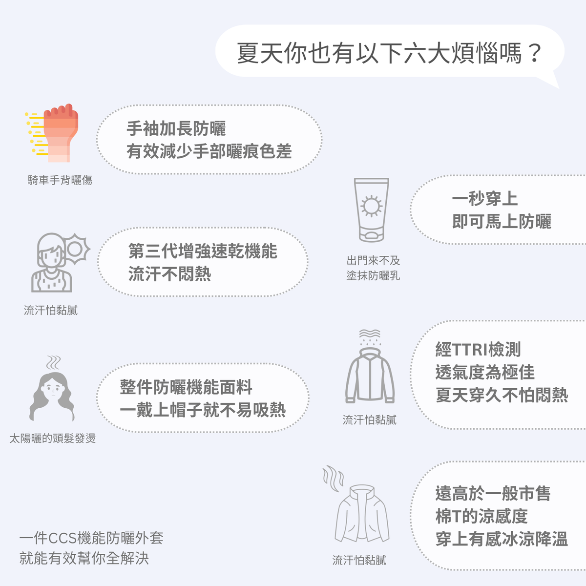 流汗粘膩感、外套穿久怕悶熱、出門來不及塗抹防曬乳
