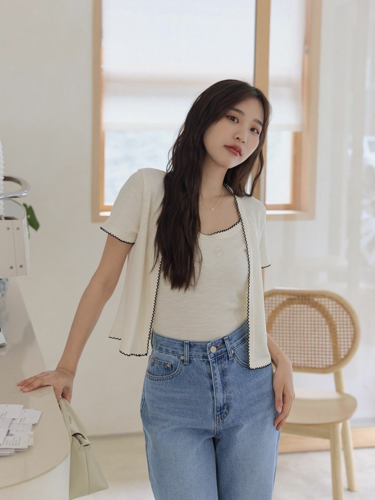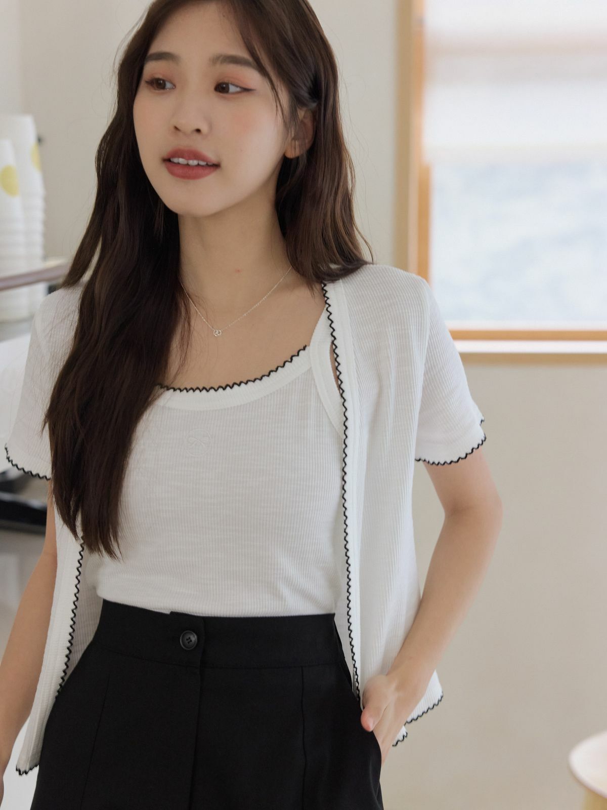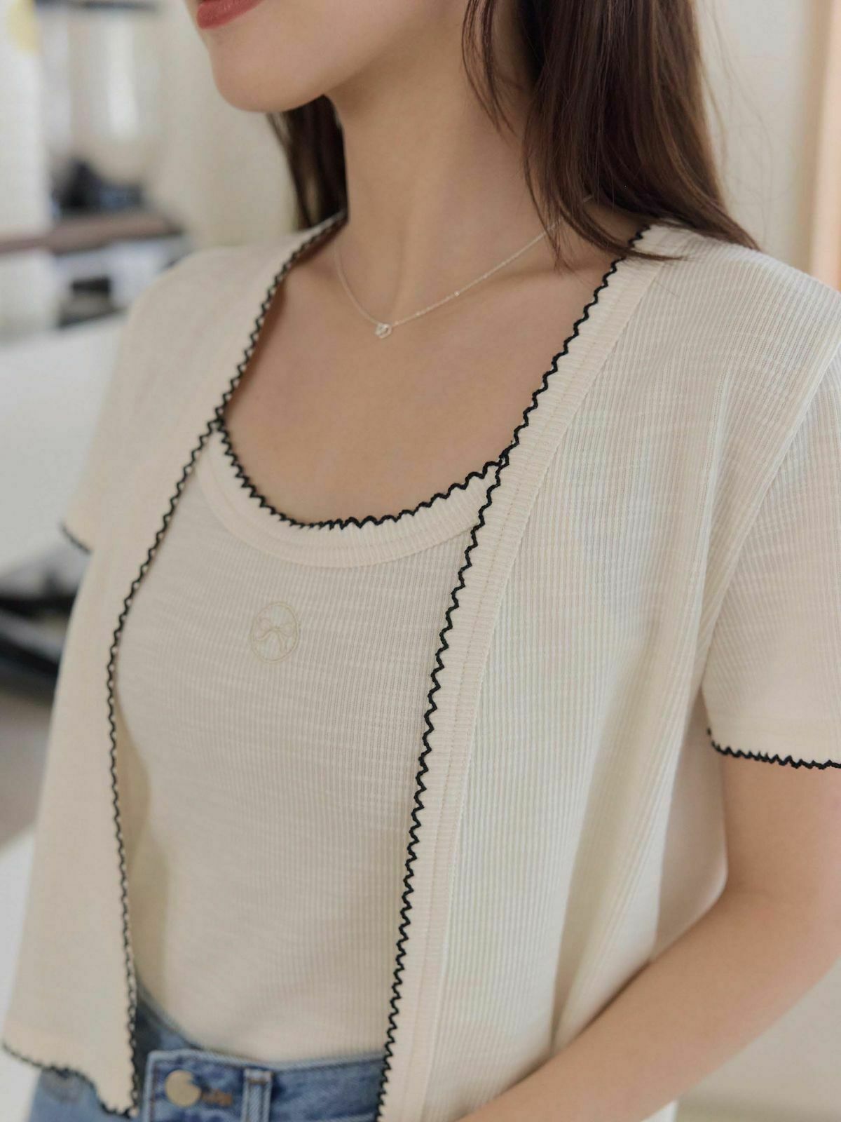 一套包含『刺繡細肩背心+波浪邊撞色罩衫』